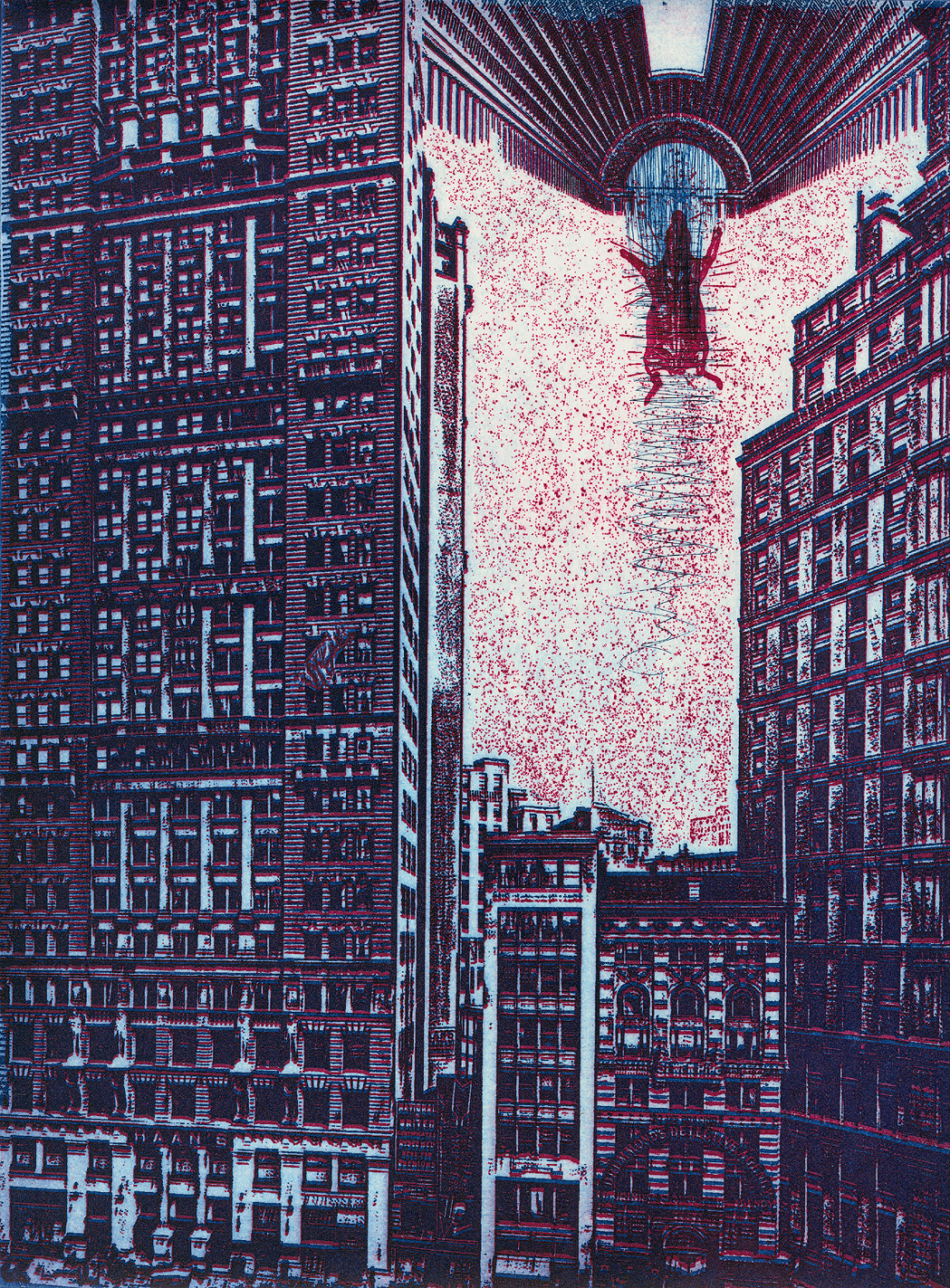 2015, Radierung, gedruckt von zwei Platten (Kupfer, Zink) auf Hahnemühl Bütten 300g/m²,Blattformat: 40 x 30cmFormat der Druckform: 25 x 20cm
